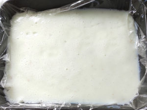 ![]() ⑤バットなどにラップを敷き、ミルクゼリーを流し入れ、冷蔵庫で30~40分冷やし固めます。 |