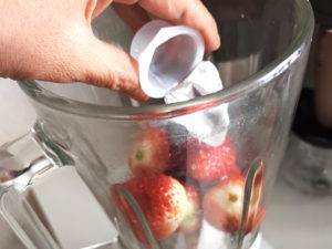 ![]() ⑥ミキサーにヘタを取った苺6個とガムシロップを2個加え、滑らかになるまで攪拌しましょう。 |