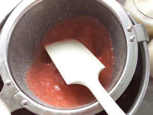 ![]() ⑧ミキサーにかけた苺は裏ごしして、ソースにします。 ⑨飾り用の苺は、ヘタを取り、半分に切りましょう。 |