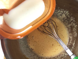 ![]() ②ボールに牛乳を少しずつ加えながら、その都度よく混ぜます。 |