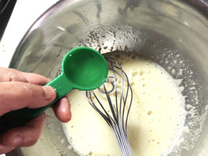 ![]() ①ボールに卵と砂糖を入れ、卵のコシが切れるまでしっかり目に混ぜます。 |