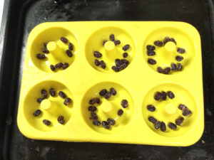 ![]() ⑧シリコン型に、甘納豆を等分に散らします。 |