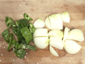 ![]() ①玉ねぎは皮をむいて薄切りに、ピーマンは種とヘタを取り、細めに切ります。 |