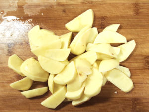 ![]() ②じゃがいもは皮をむき、先に半分にカットしてから、うすいくし形に切ります。 ③耐熱容器にじゃがいもを並べ、ラップをして、レンジで6分ほど加熱しましょう。 |