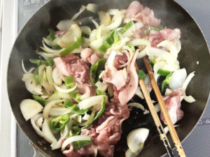 ![]() ④フライパンに薄く油(分量外)を引き、肉と玉ねぎ、ピーマンを炒めます。 ⑤玉ねぎがしんなりして、肉が白くなればOK。 |