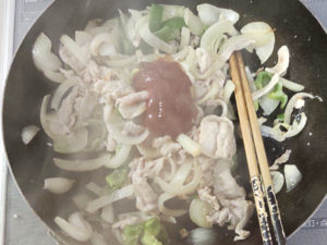 ![]() ⑥具材に火が通ったら、スイートチリソースとケチャップを加え、全体に味を絡めます。 |