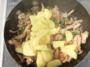![]() ⑦レンチンしたじゃがいももフライパンに加え、木べらに持ち替えて、いもを崩さないように全体に味を絡めればOK。 |