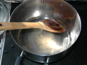 ①鍋に水と粉寒天を入れ、良く混ぜて寒天を溶かします。