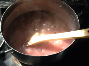 ④ふつふつと泡が立ったら、5~8分ほど煮詰め、木べらでこそげた時に跡が付くくらいまで煮詰めます。