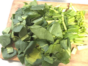 ![]() ①小松菜は根元を落とし、ざく切りにします。 |
