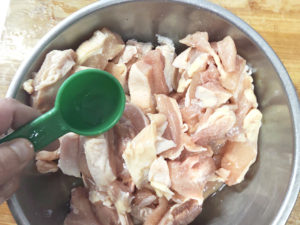 ![]() ③ボールに鶏肉、酒、塩を入れて手でよくもみ込みます。 |