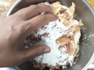 ![]() ④ボールに片栗粉も加え、全体に粉をまぶしましょう。 |