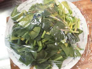 ![]() ⑤小松菜を耐熱容器に入れ、ラップをして、レンジで2~3分加熱します。 |