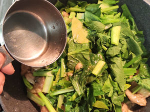 ![]() ⑧肉に火が通ったのを確認したら、小松菜と溶かしておいた調味料を加え、全体に絡めましょう。 ⑨軽くとろみがつけばOK。 |