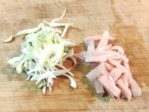 ![]() ①生姜の甘酢漬けは細切りに、ネギは斜め薄切りにします。 |