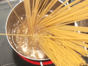 ![]() ②大きめの鍋にたっぷりのお湯を沸かし、パスタをパッケージの時間通りにゆでましょう。 |