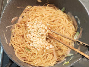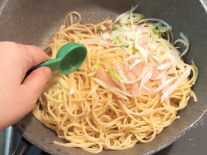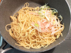 ![]() ③フライパンにゆでたパスタと生姜、ネギを加え、油を引かずに30秒ほどさっと炒めます。 |