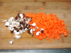 ①人参は皮をむき、小さめに切り、椎茸も軸を取り、人参と同じくらいの大きさに切ります。