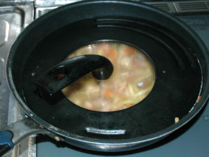 鶏肉にしっかりと火を通すために、蒸し焼きにしています。