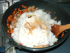 ⑥温かいご飯をフライパンに加え、しゃもじで混ぜましょう。