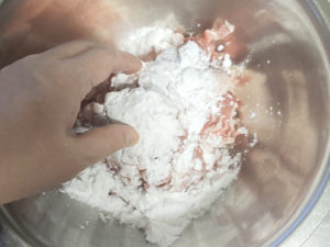 ![]() ①豚肉と片栗粉をボールに入れ、全体に混ざるように手でもみこみます。 |