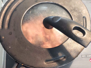 ![]() ④肉に8割がた火が通ったら、蓋をして、弱火で2~3分蒸し焼きにしてしっかりと火を通しましょう。 |