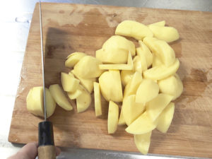![]() ①じゃがいもは皮をむき、縦に半分に切ってから、1cm幅くらいのくし形に切ります。 |