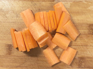 ![]() ②人参も皮をむき、少し薄めの棒状に切りましょう。 |