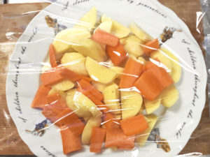 ![]() ③耐熱皿にじゃがいもと人参を乗せ、ふんわりとラップをかけたら、レンジで6~8分加熱します。 |