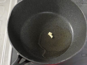 ![]() ④フライパンに油とにんにくを入れて弱火にかけ、香りを出しましょう。 |