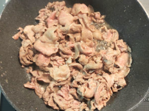 ![]() ⑤豚肉をフライパンに加え、色が白くなって完全に火が通るまで炒めます。 |