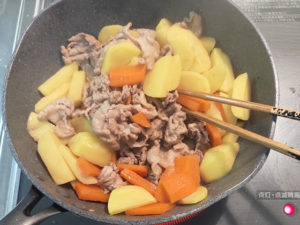![]() ⑦じゃがいもと人参もフライパンに加え、中火で2分ほど炒め、再び全体に味を絡めればOK。 |