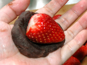 手の上で苺を包むと、ころころ手の上で転がすだけで、簡単に苺をあんこで覆えます。