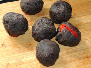 ![]() ②餡子を適量(つぶした時に苺より一回り大きいくらい)手に取り、つぶした上に苺を乗せ、そのまま手の上で転がし、餡子で覆います。 |