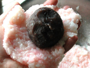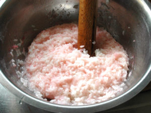 ![]() ④ご飯が炊き上がったらボールに移し、水で溶いた食紅を加えて混ぜ、めん棒などで若干粒が残る程度につぶします。 ⑤室温で冷まし、手で握れるほどの熱さになるまで冷ましましょう。 |