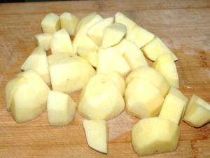 ![]() ①じゃがいもは皮をむき、一口大に切り、一旦水にくぐらせてから、ふんわりとラップをし、レンジで6~8分加熱します。 |