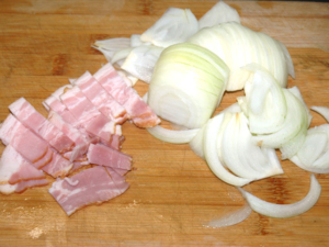 ![]() ②玉ねぎは薄切り、ベーコンは太めに切ります。 |