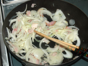 ![]() ③フライパンで玉ねぎとベーコンを炒め、玉ねぎがしんなりするまで炒めましょう。 |