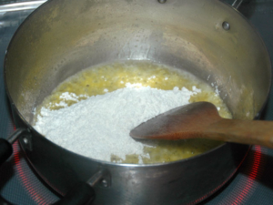 ![]() ④鍋にマーガリンを溶かし、溶けたら薄力粉を加え、弱火でペースト状になるまで混ぜます。 |