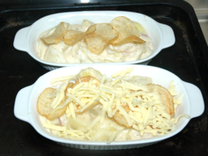 ![]() ⑧グラタン皿に、クリームごとすくい入れ、上にポテチとチーズを乗せたら、オーブンで焼きます。 |