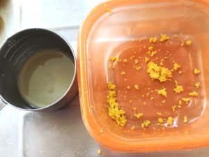 ![]() ①レモンは皮をお湯で洗った後、水分を拭き取り、おろし金で皮をすりおろし、レモン汁も絞っておきます。 |