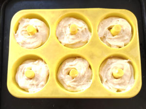 ![]() ⑩クリームの絞り袋の先を少し切り、ドーナツ生地を詰めて、型にぐるりと絞りだしましょう。 |