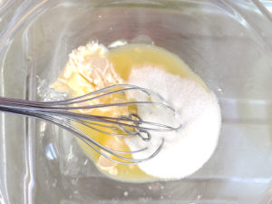 ![]() ②耐熱ボールにマーガリンを入れ、レンジで20秒ほど加熱して柔らかく(マヨネーズ程度まで)してから、砂糖を入れて、ザラザラ感がなくなるまで混ぜましょう。 |