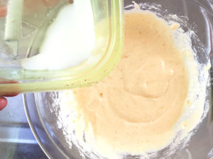 ![]() ⑤牛乳を少しずつ加え、その都度よく混ぜましょう。 |