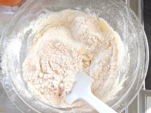 ![]() ⑥薄力粉とベーキングパウダー、アーモンドパウダーを合わせてふるい入れ、ゴムベラに持ち替えてさっくりと混ぜます。 |