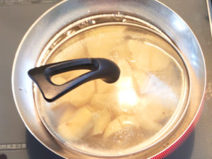②鍋にじゃがいもとかぶるくらいの水と塩小1/2(分量外)を入れて火にかけ、じゃがいもが柔らかくなるまでゆでましょう。