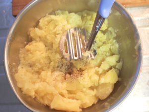 ③ゆでたじゃがいもの水気を切り、塩と黒胡椒、マヨネーズを加えてつぶしながら混ぜ合わせます。
