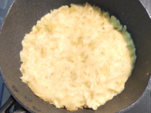 ④テフロン加工のフライパンにサラダ油大1(分量外)を引き、じゃがいもを円く平らになるように広げましょう。