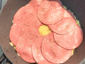 ⑤じゃがいもの上に、スライスタイプのボロニアソーセージを乗せ、上から、ローズマリーをふりかけます。