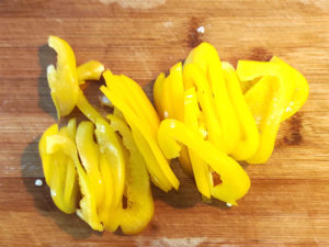 ![]() ④パプリカは、種とヘタを取り、細切りにしましょう。 |